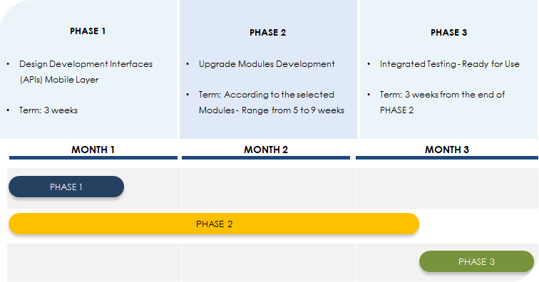 The scope of the Project will be limited to the Modules / Components that it is decided to develop. Unlike the WEB APP Option, the aforementioned modules will be integrated into the Corporate and Information Systems Strategy through the development of the Interface layer (APIs)